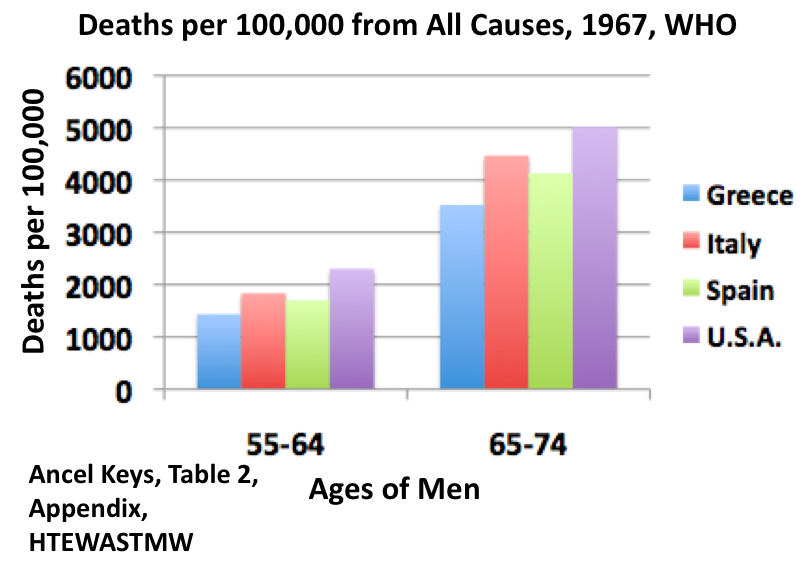 Interestingly, there was one major difference between the results observed in Dr. Estruch’s study compared to the earlier results observed by Dr. Keys. This was that in the Estruch study, there were no differences in the rates of total deaths from all causes between the populations consuming the Mediterranean diet and the Control population that was consuming a standard low fat diet (Death from any cause 0.82 (0.64–1.07); 0.97 (0.74–1.26); 1.00 (control); p values were 0.15 and 0.82). In contrast, at the time of Ancel Keys’ study, there were in fact lower total death rates (from all causes) in populations who consumed a Mediterranean diet compared to the participants in the U.S.A. and northern Europe, who consumed a classic “Western” style diet (See figures below). The differences in this important outcome were probably due to the fact that at the time of Keys’ investigations, the populations had been on the Mediterranean diet for most of their lives and they had received more comprehensive protective effects. Also, the populations in other regions were consuming a higher fat diet.