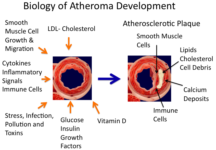 Let’s review some of the biological mechanisms that are now being investigated for their effects on the development of plaques in the coronary arteries. The following figure shows that there are many biological factors that affect the health of the artery. On the left is a spanking clean artery, and on the right is an artery that has an atherosclerotic plaque. The surrounding arrows on the left show that there are many biological processes that influence and stimulate plaque development.