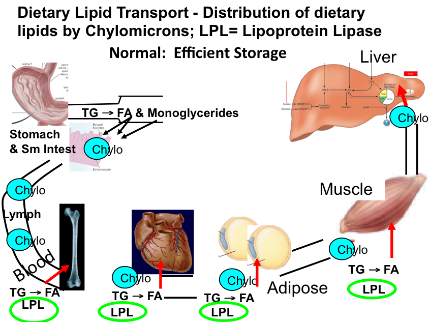 Fat is digested in the small intestine and is taken up by intestinal cells and packaged into a special lipoprotein called a chylomicron (Chylo). Chylomicrons are transported in the lymph and are dumped into the blood at the thoracic duct. Once the chylomicrons enter the blood they travel to peripheral tissues where an enzyme called Lipoprotein Lipase (LPL), which is on the surface of the vessels, traps the chylomicrons and cause hydrolysis of the triglycerides to free fatty acids. Through a mechanism that is not understood, these fatty acids enter the various tissues, where they are used for energy (bone marrow, muscle) or where they are stored (adipose tissue, aka fat cells). After permeating through the body what ever is left of a chylomicron particle is taken up by the liver. The most amazing thing about this process is its efficiency and speed; the half life of a chylomicron particle is five minutes.