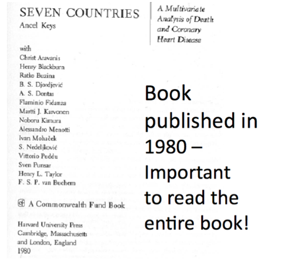 The premier study at that time was “Seven Countries” Study that was directed by Dr. Ancel Keys, a renown epidemiologist at the University of Minnesota. This was a massive study that followed 12,763 men, aged 40-59, from seven countries: Finland, Greece, Italy, Japan, the Netherlands, the United States, and Yugoslavia. The overall findings (from many published articles) of these studies, including the 10-year follow-up, were published in a book, “Seven Countries” by Ancel Keys (1980).