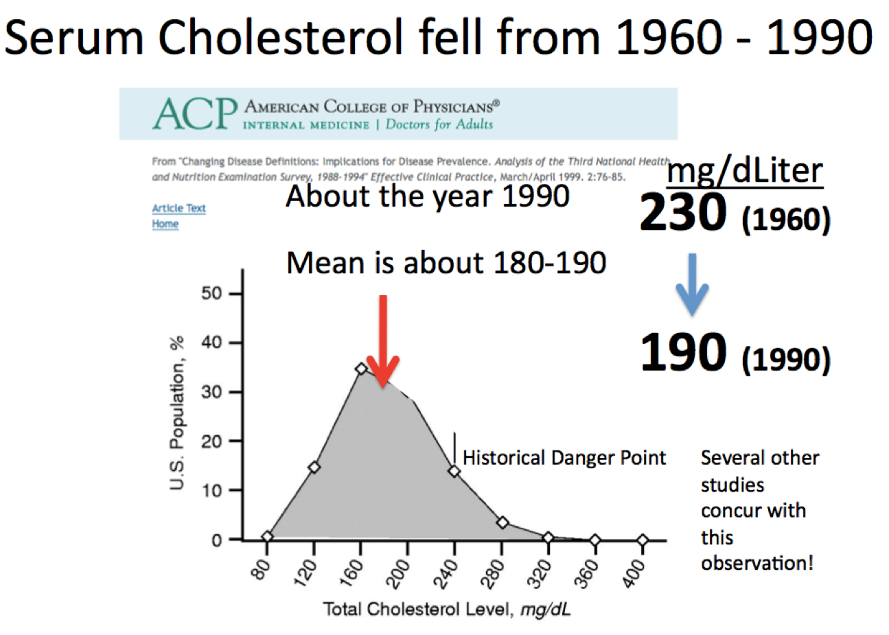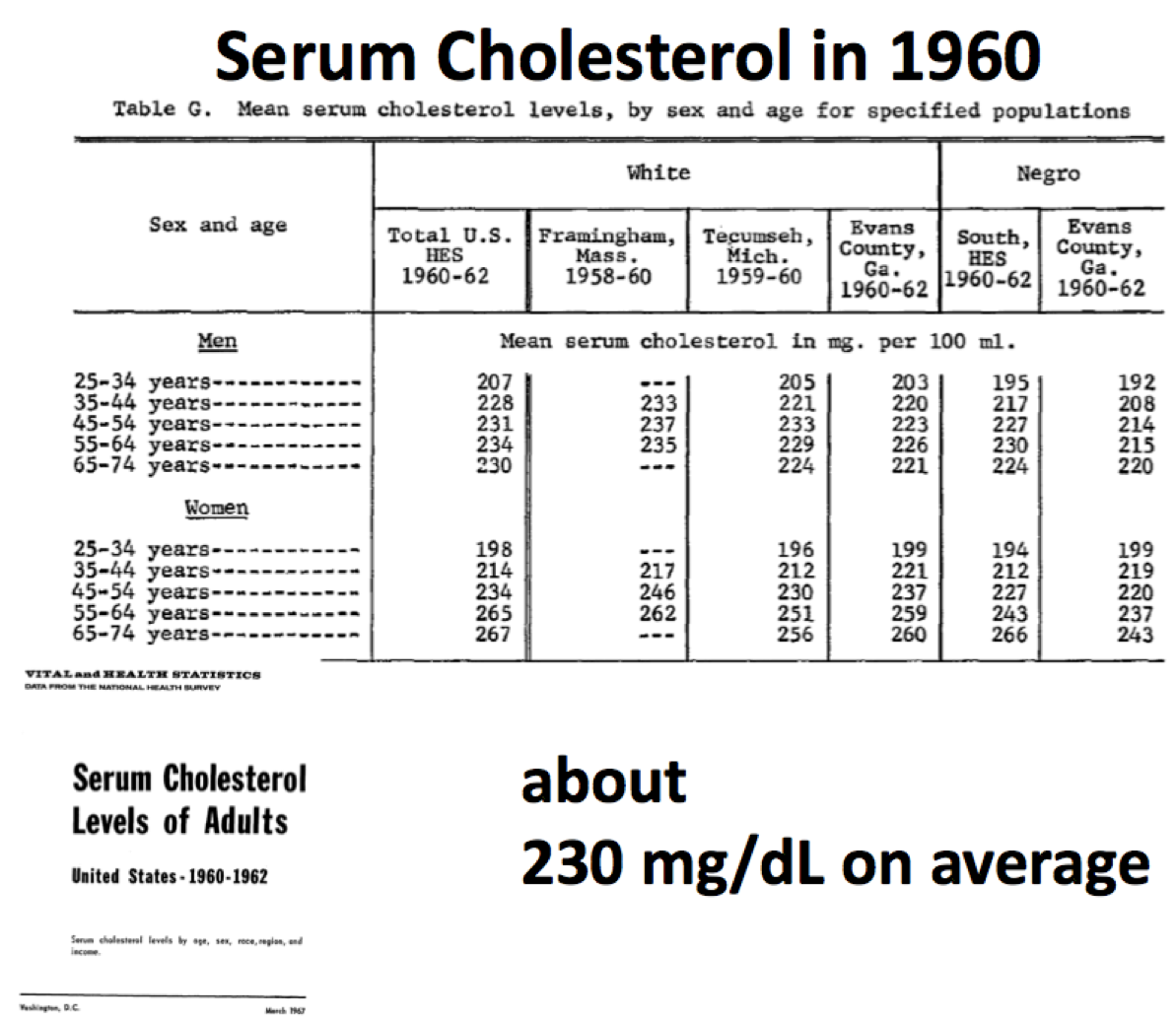 For example, in 1960, several studies measured blood cholesterol at 230 mg/dl in American adults. By 1990, the mean serum cholesterol concentration in American adults had fallen to 190 mg/dl. During this time, the numbers of heart attacks peaked in about 1970 and started to progressively fall afterwards (See data from the AHA below). And after statin drugs were introduced starting in the 1980s, the results were that many men who would have died in their 40s & 50s, died of heart attacks much later, such as in their 70s & 80s. My father had his 1st attack at the age of 85. Many of us have benefited greatly by having our fathers 20-30 yrs longer because of Ansel Keys and the those who proposed the cholesterol hypothesis.